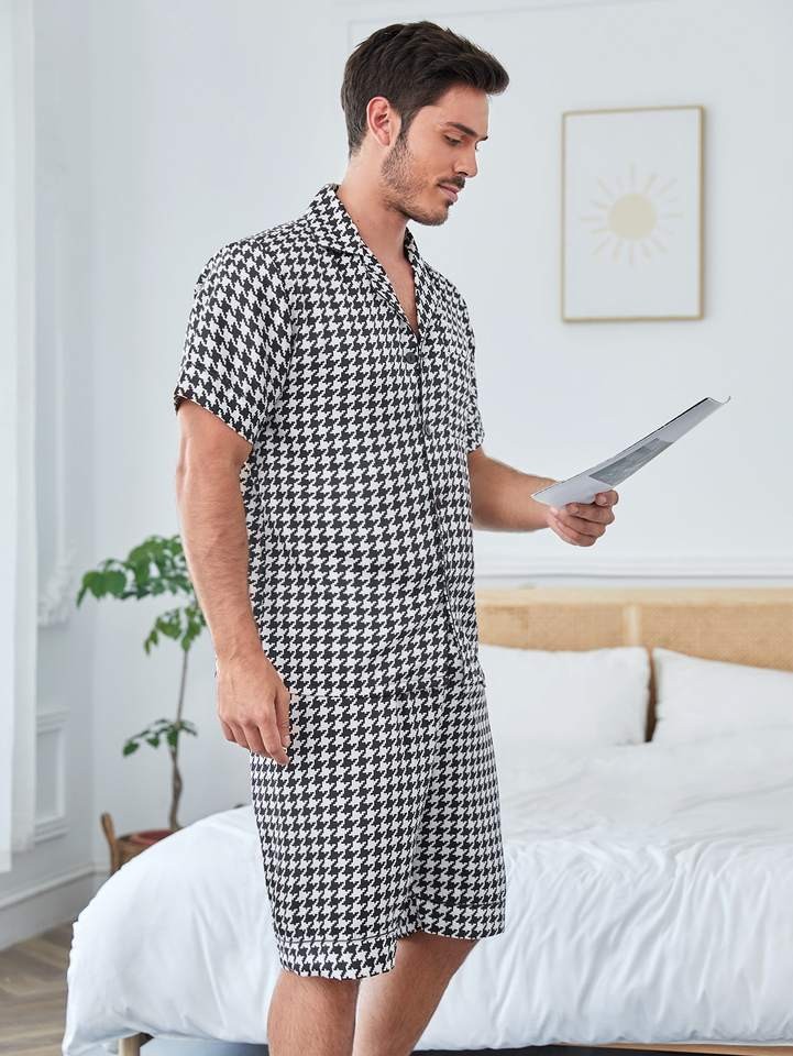 Summer Short 2 Piece Men's Sleepwear Houndstooth Plaid Print Loungewear Shorts Custom Cotton Mens Pajamass